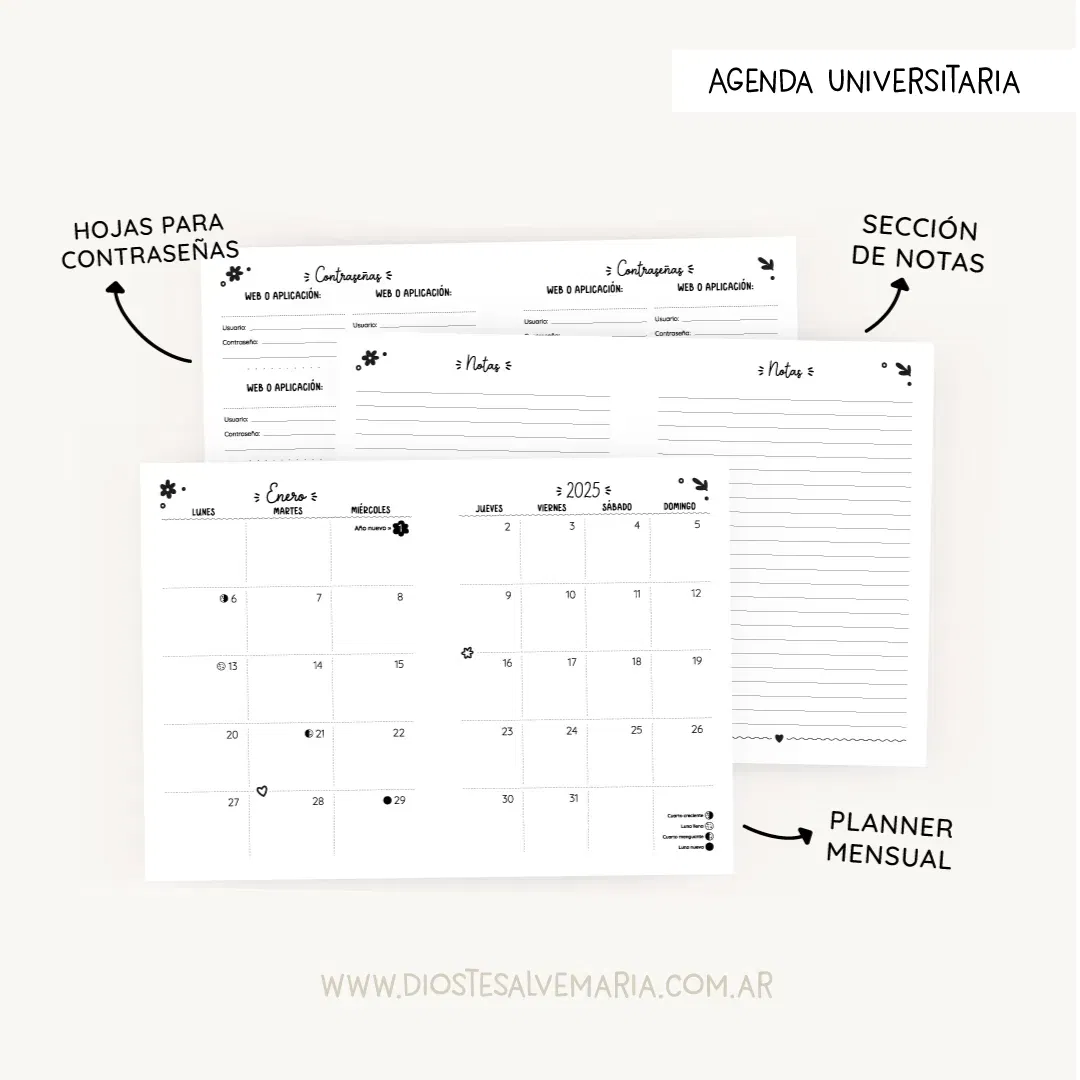 Por cada mes trae planificador mensual, seguimiento de hábitos y las semanas del mes con fechas