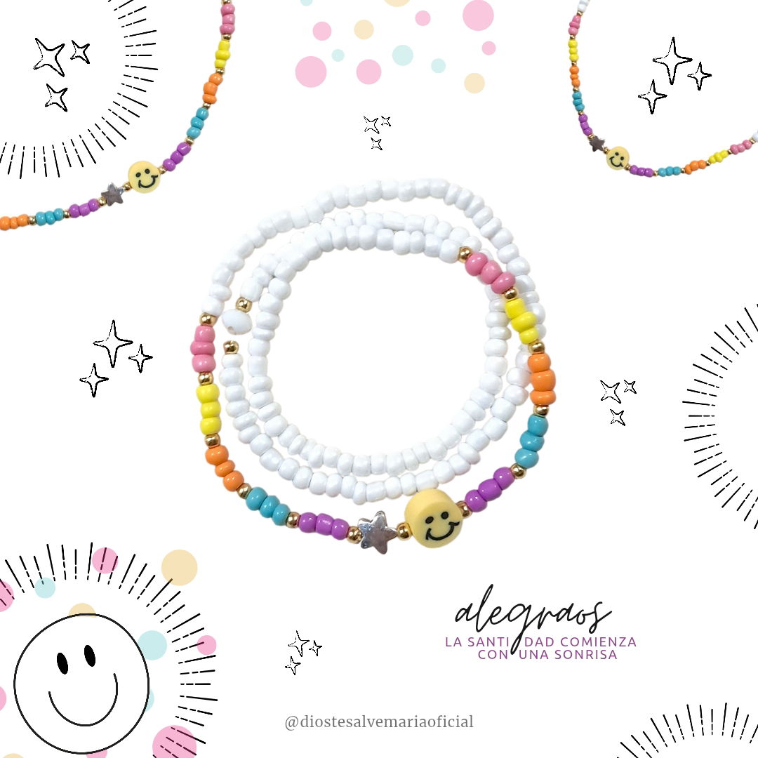 Las cuentas blancas representan la pureza del corazón que confía. Los colores vivos, la alegría de vivir con Jesús. Y la carita feliz te recuerda que hasta una sonrisa puede ser oración.