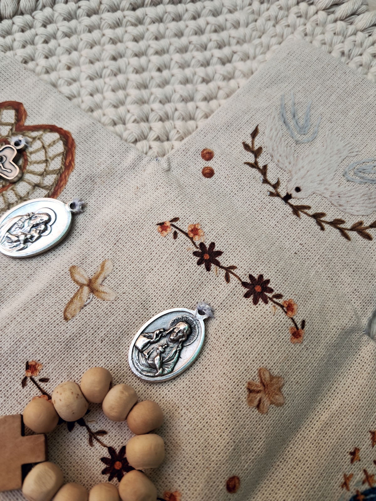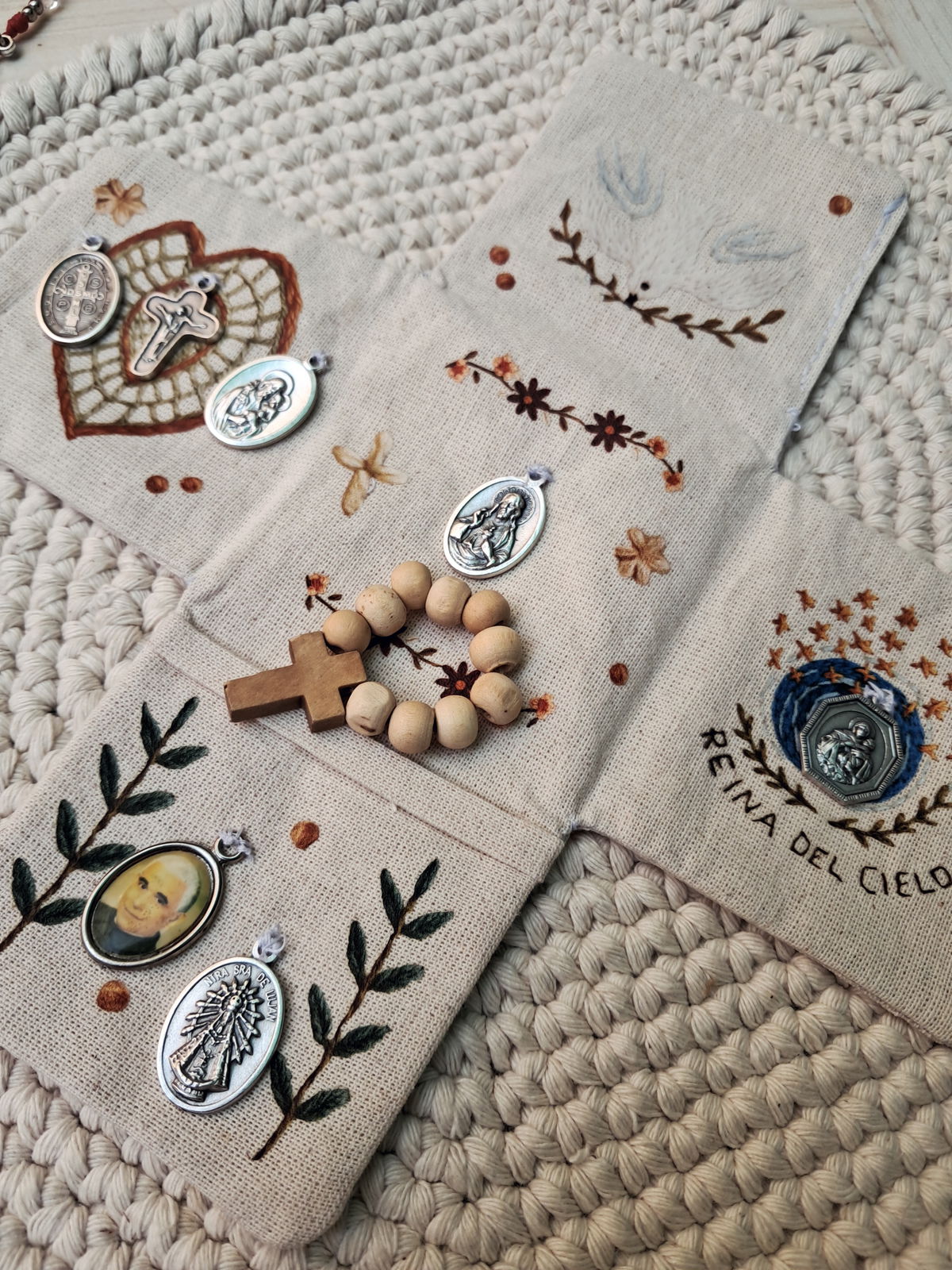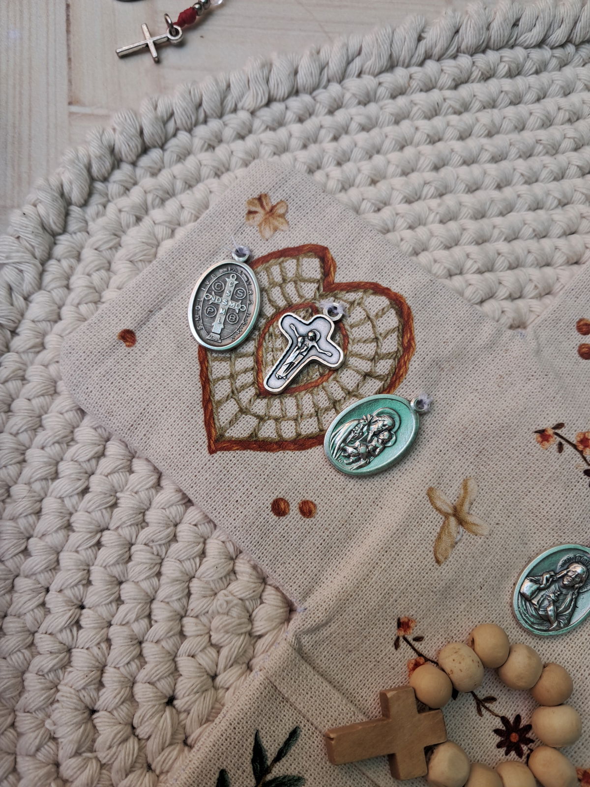 Medallas: podés elegir 1 cruz y 4 medallas, (si quieres agregar una medalla tiene un costo de $1000) según lo que tu corazón necesite (Virgen María, San José, Sagrado Corazón, Jesús Misericordioso, Ángel de la Guarda, entre otros).