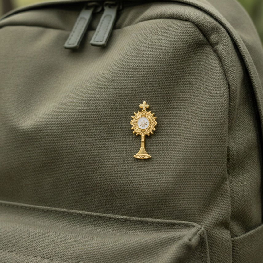 Este pin con forma de Custodia es un recordatorio delicado y profundo de la presencia real de Jesús en la Eucaristía, para llevar cerca del corazón todos los días.