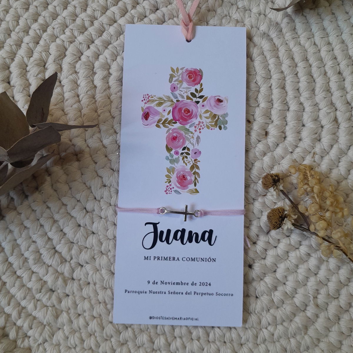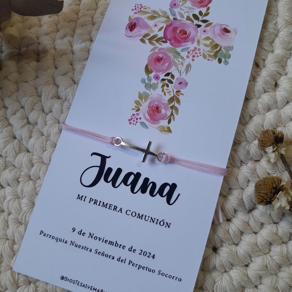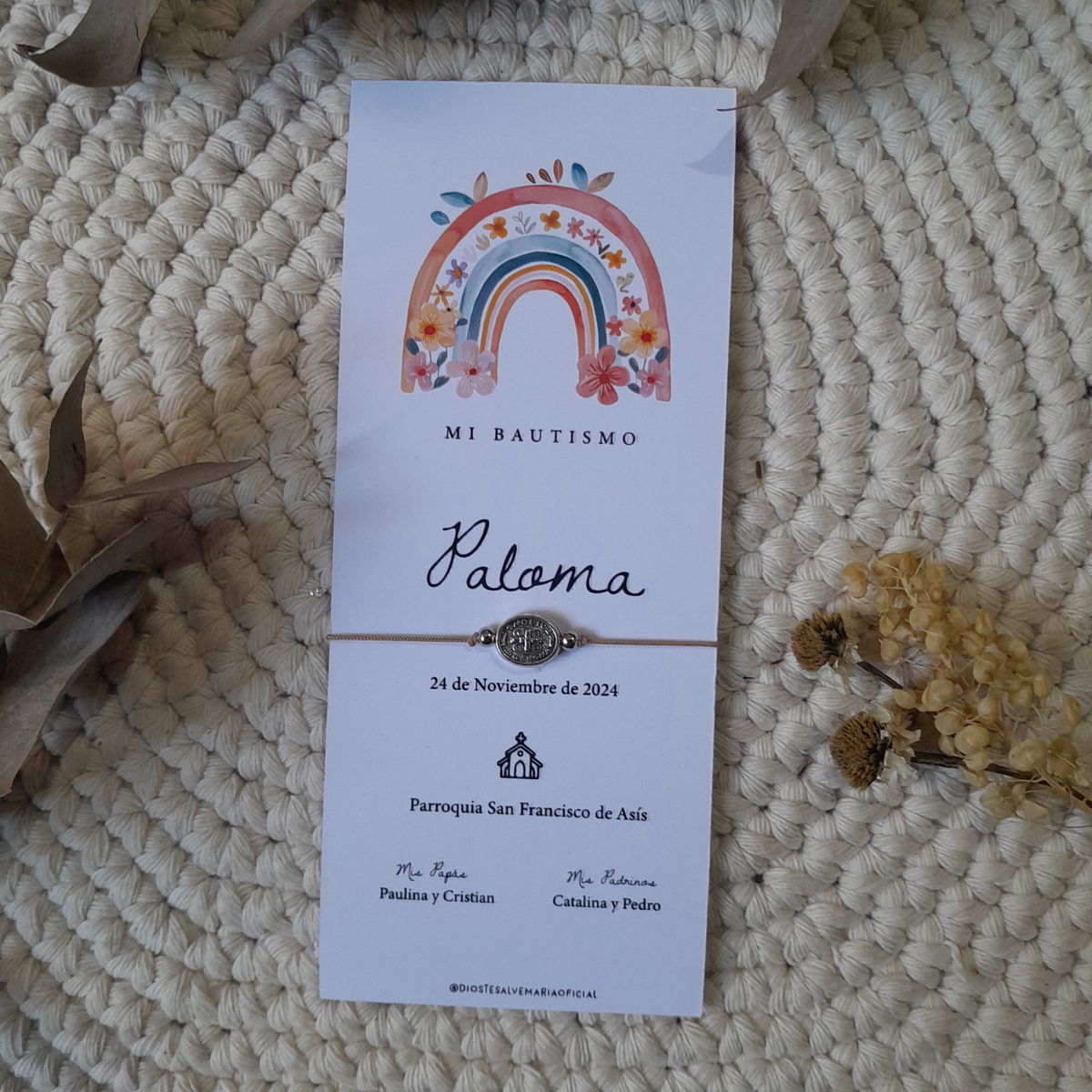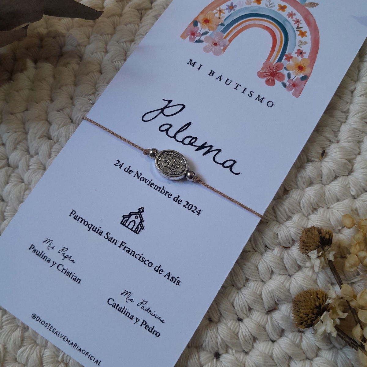 Incluye tarjeta con frase: "San Benito protégeme siempre”. pulserita ajustable + tarjeta con frase + bolsita de celofán.