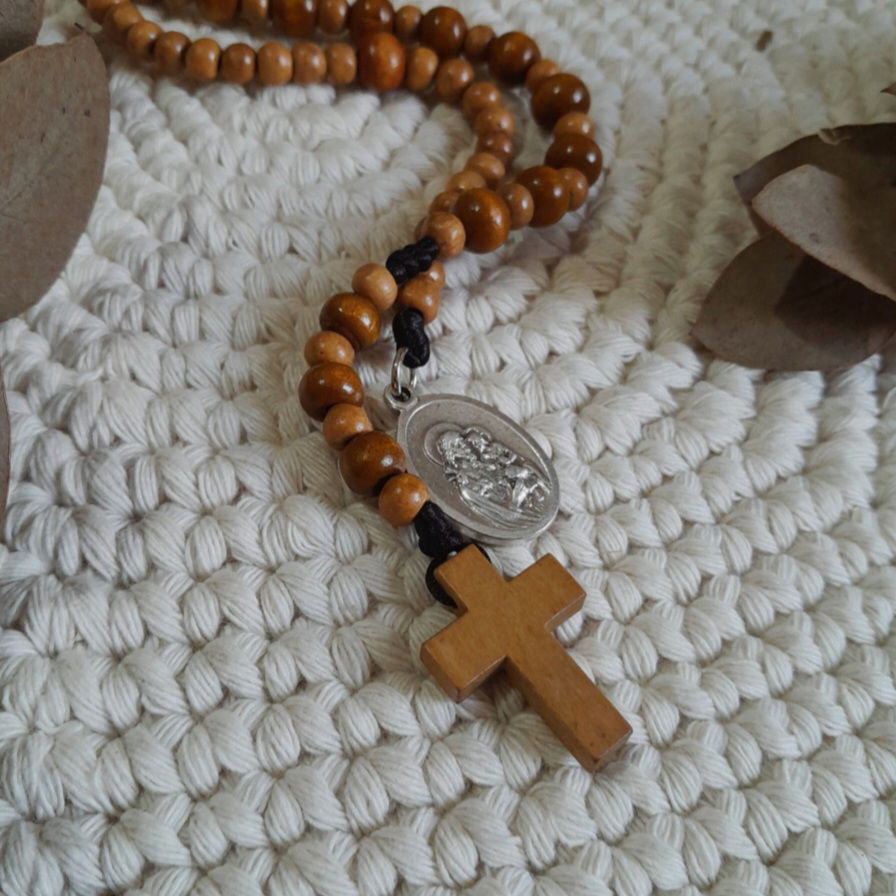Elaborada con hilo negro, madera, medalla italiana y aleación de metales.