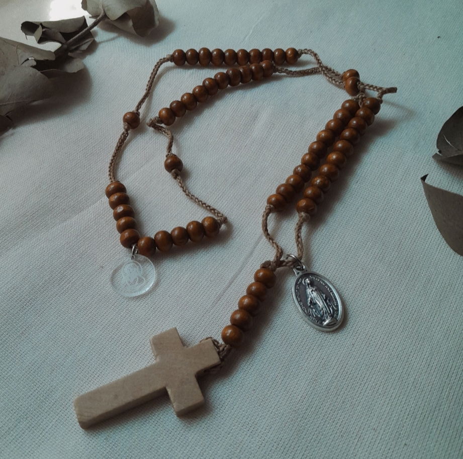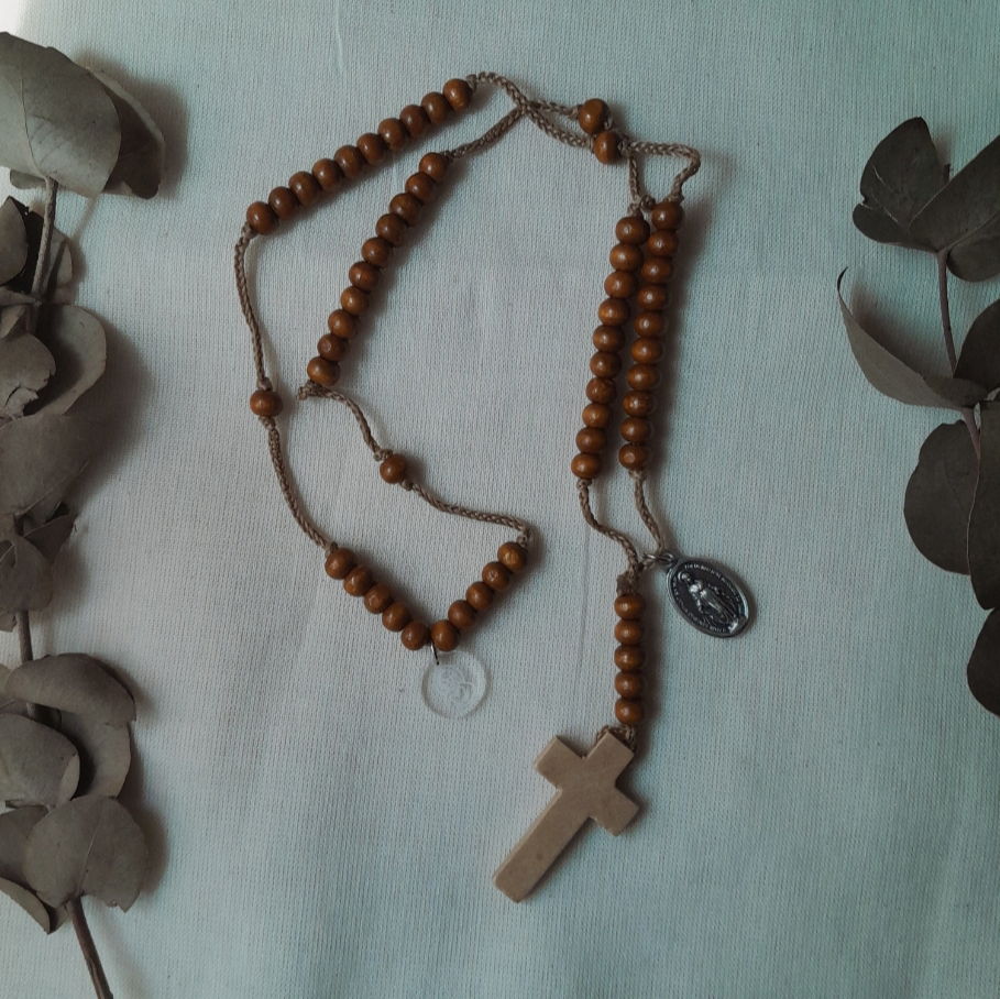 Rosario de hilo de seda , cuentas , cruz de madera y medalla, viene presentado en una bolsita de lienzo.